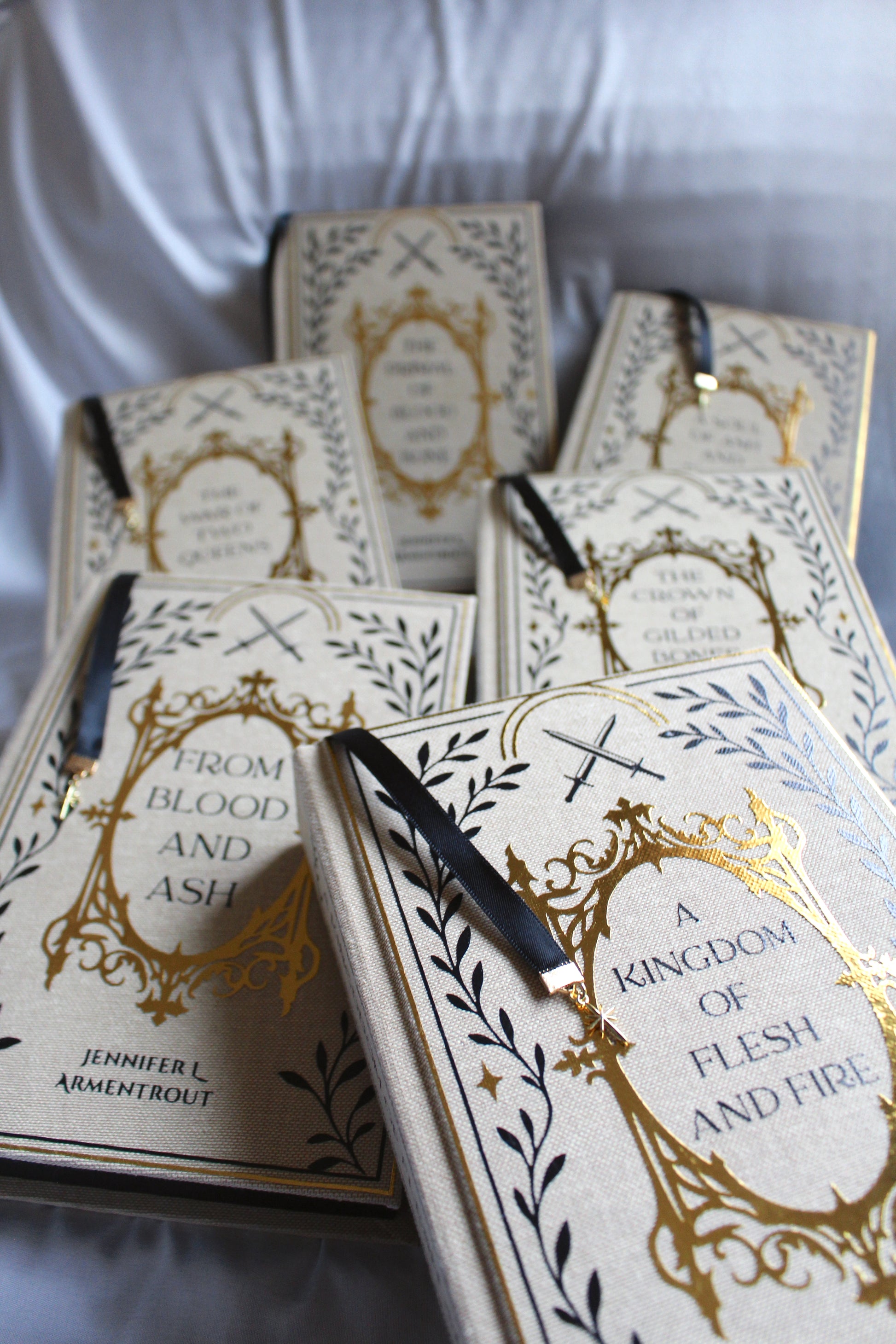 The full Blood and Ash series set rebound into a stunning linen fabric topped off with black and gold metallic vinyl with an added cute bookmark & charm ✨