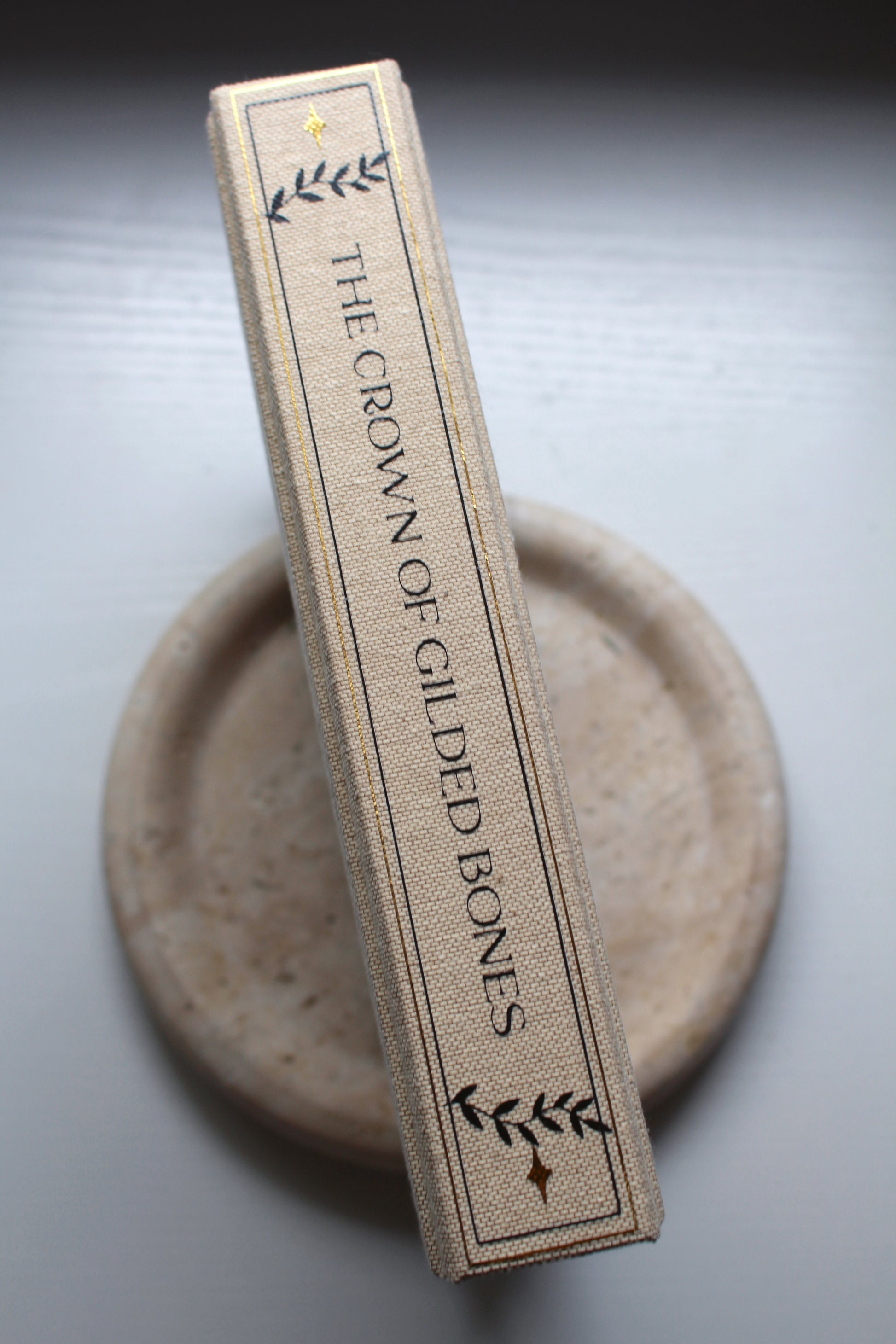 Rebound edition of The Crown of Gilded Bones by Jennifer L Armentrout bound into linen cloth with black and gold metallic heat transfer vinyl 🖤✨