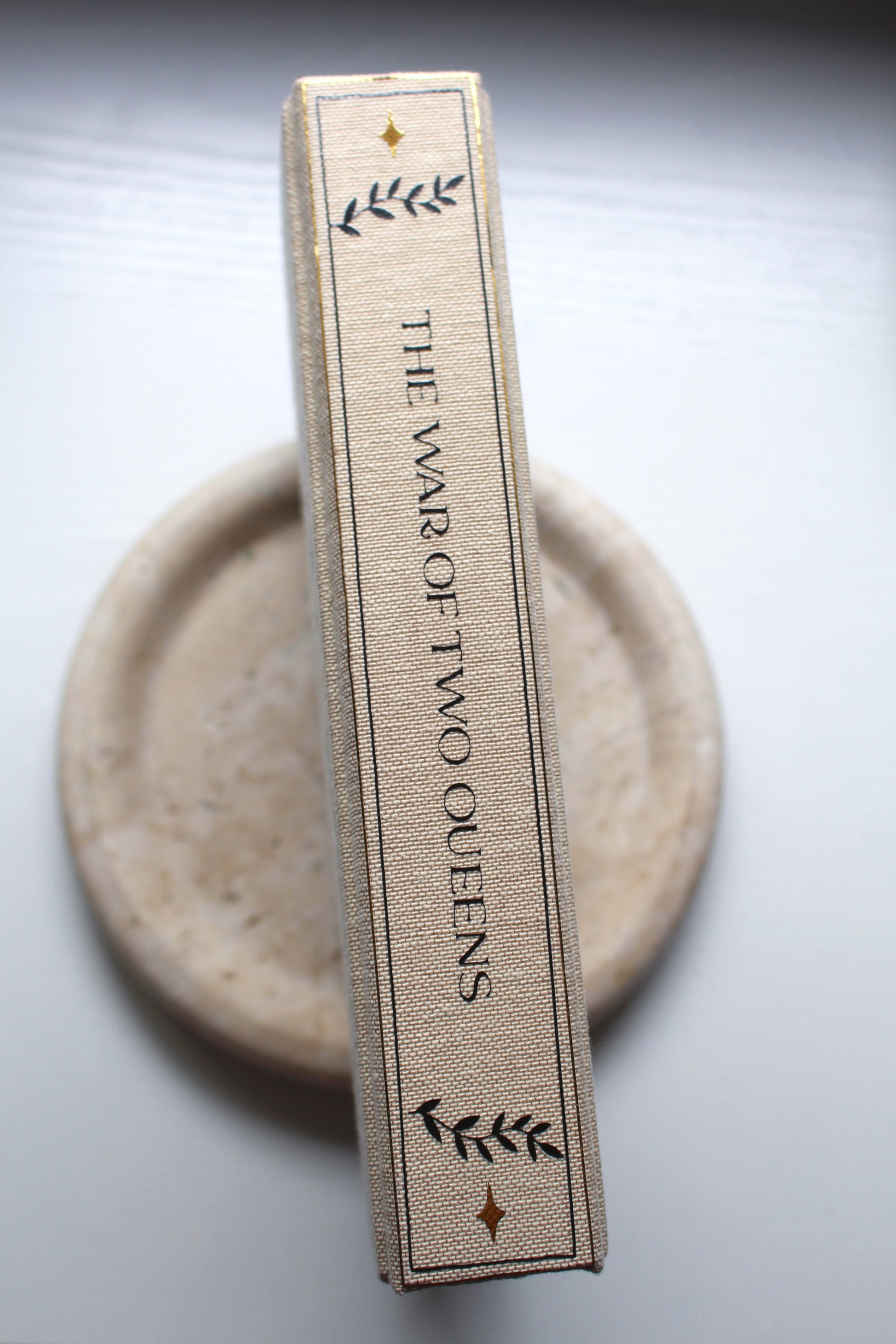 Rebound edition of The War of Two Queens by Jennifer L Armentrout bound into linen cloth with black and gold metallic heat transfer vinyl 🖤✨